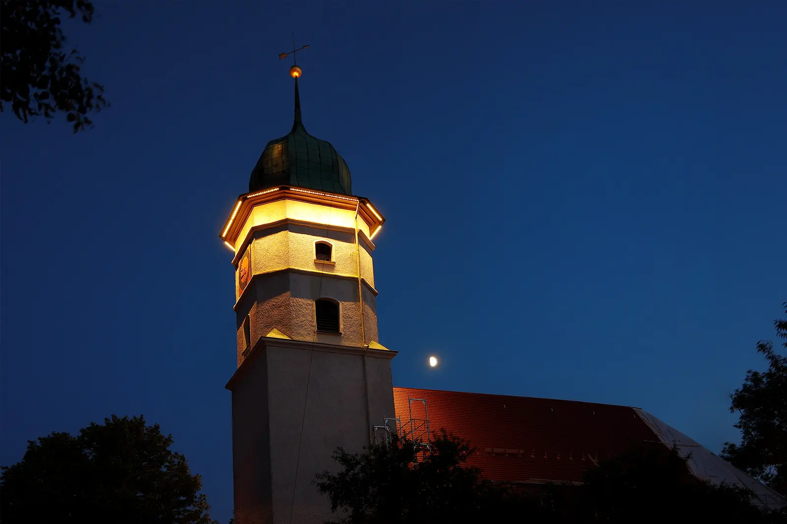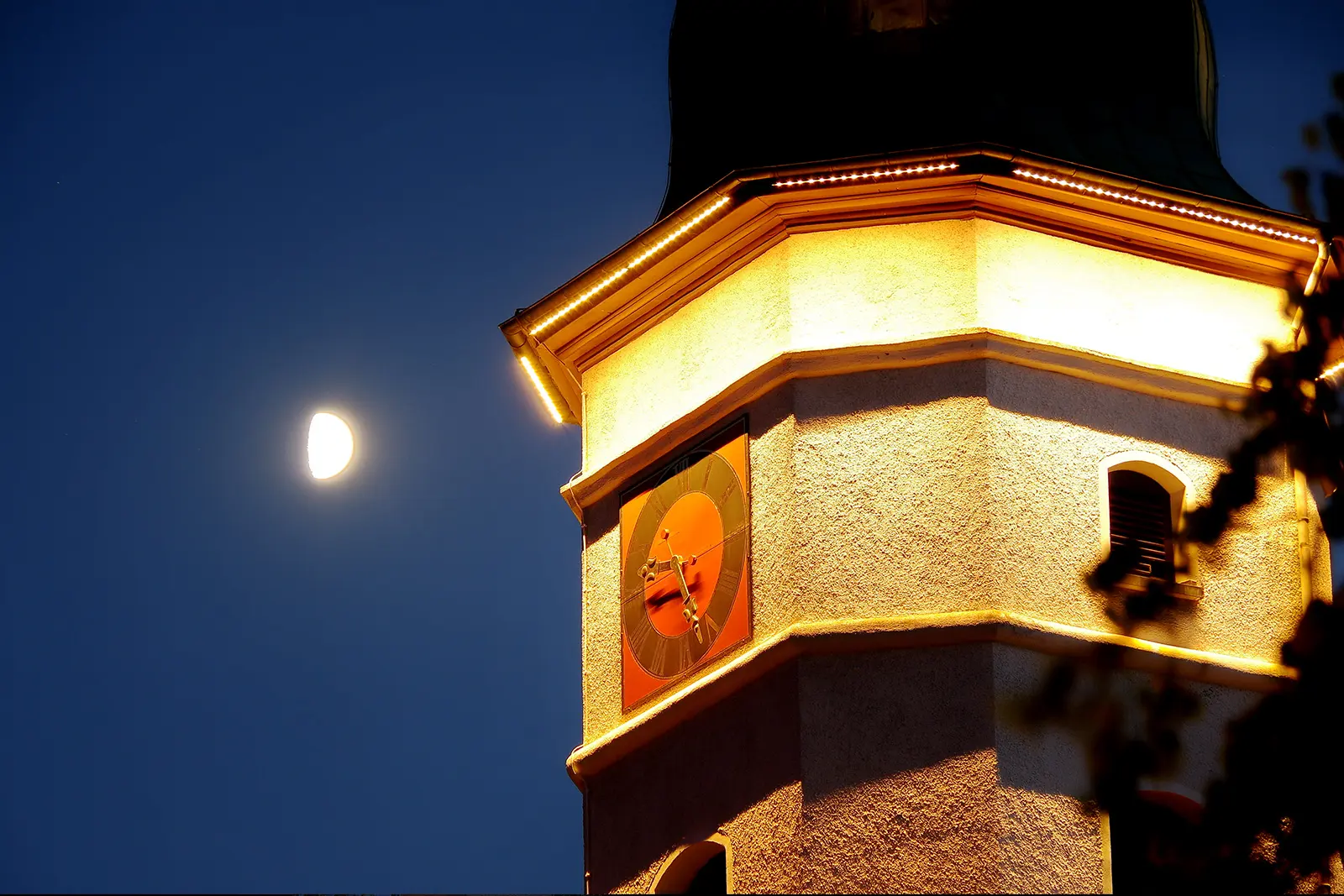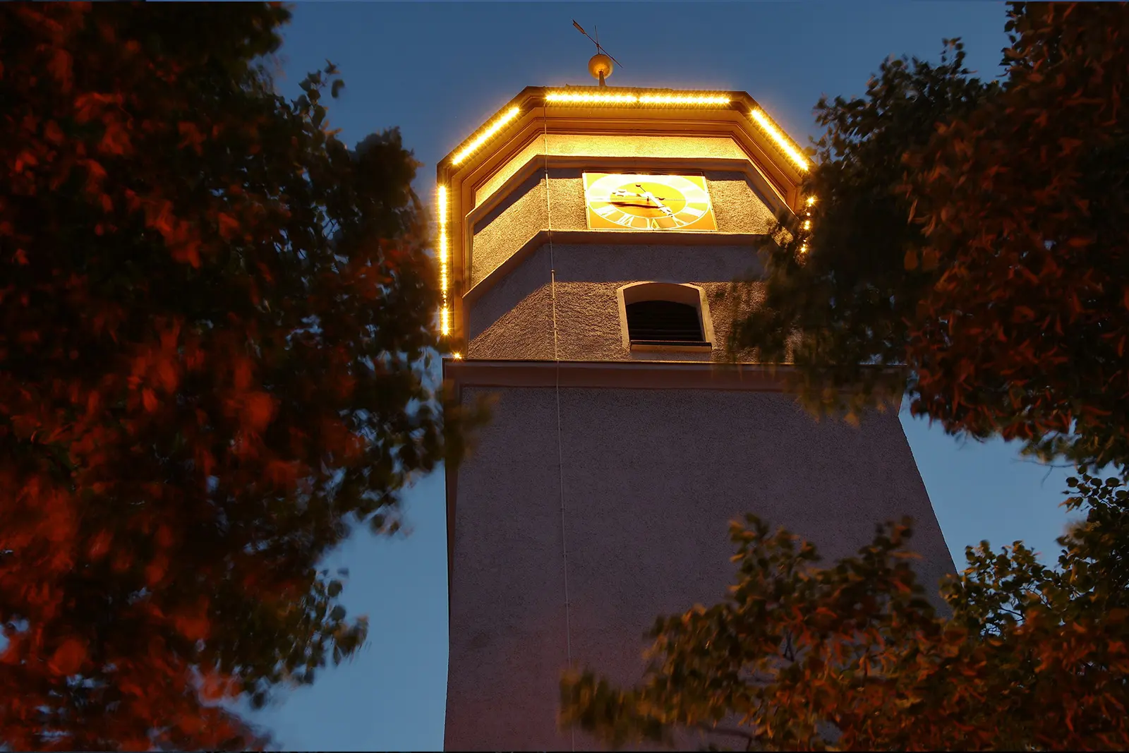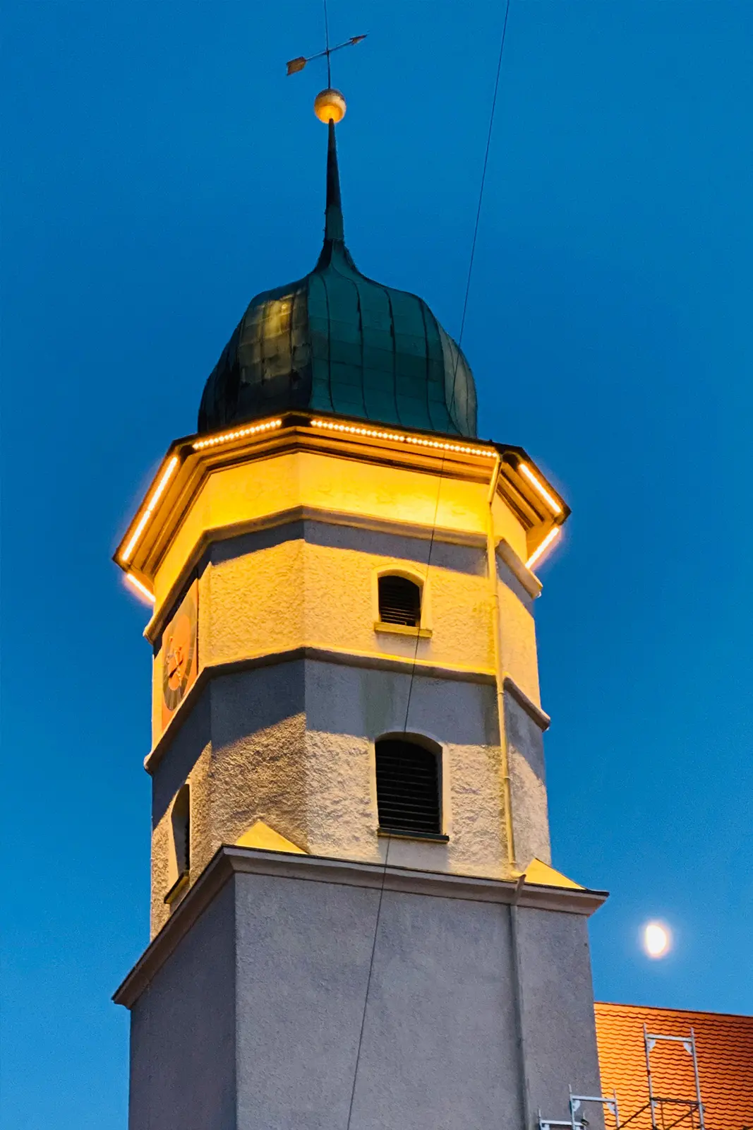 Besondere Turminszenierung durch Sonderleuchten und individuelle Lichttechnik.